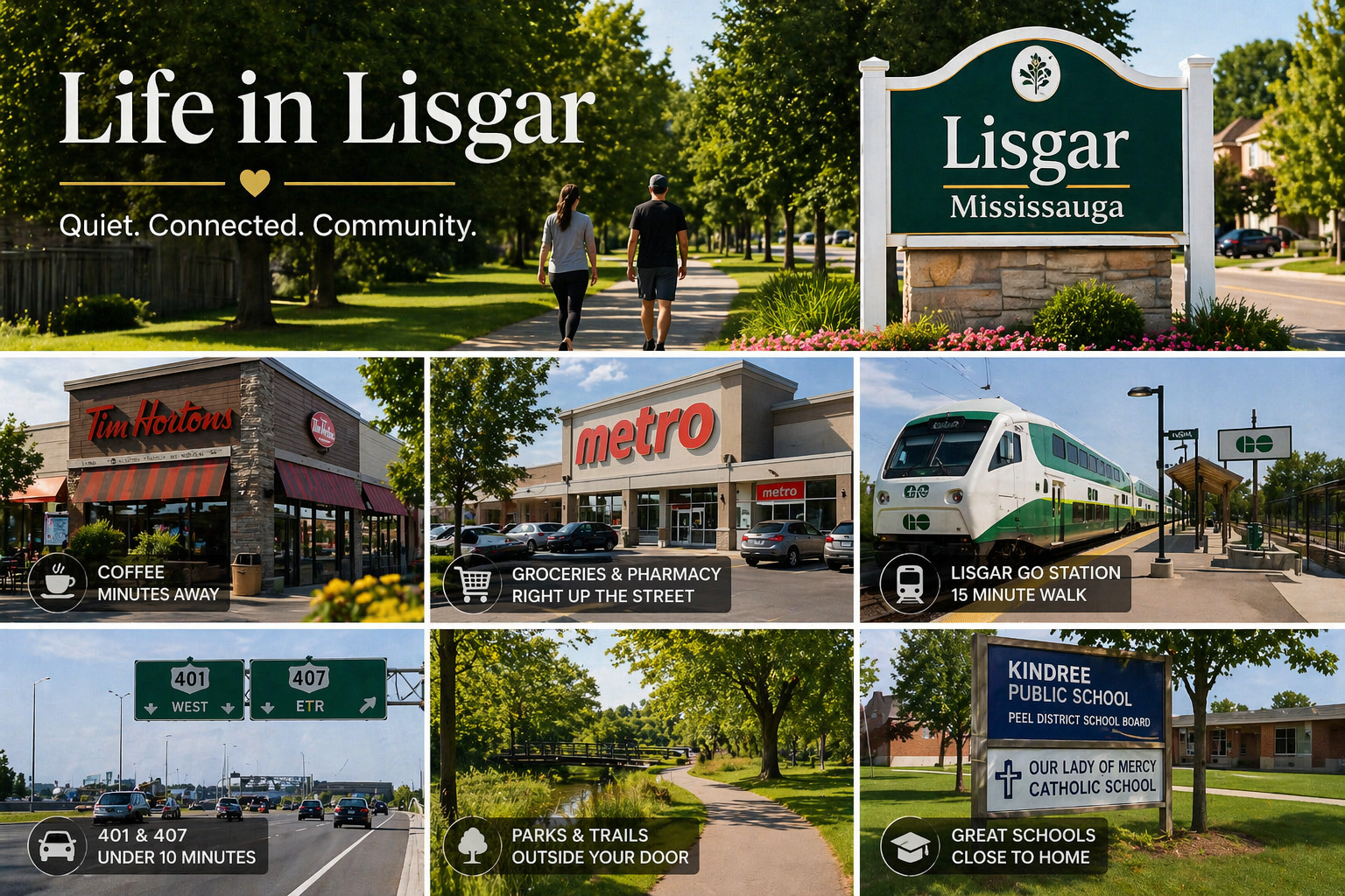 Lisgar has that “quiet but connected” rhythm people love about Mississauga’s west side. Morning coffee? Tim Hortons or Starbucks is minutes away. Groceries and pharmacy? Metro and Rexall are right up the street. Need a quick commute downtown? Lisgar GO Station is a 15‑minute walk, or you’re on the 401 or 407 in under ten minutes.