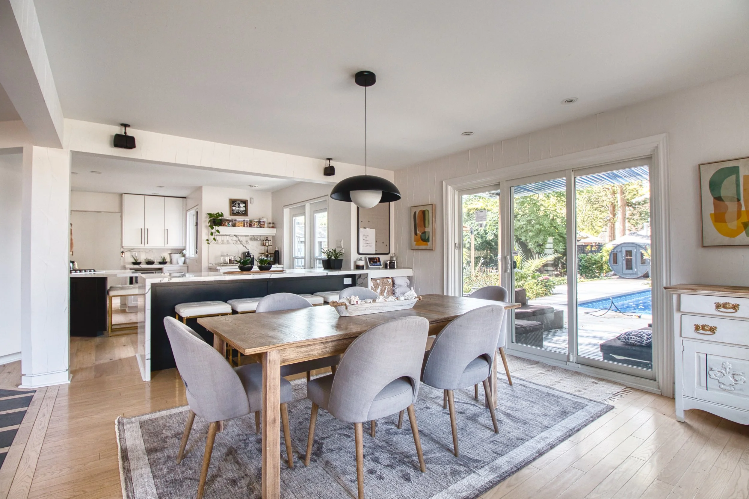 The chef’s kitchen features quartz countertops with a waterfall edge gives a modern touch to this elegant home. It features a JennAir gas cooktop with a pot filler feature, double ovens, abundant cabinetry and workspace on the oversized kitchen island. The sunlit dining room is anchored with pillars, framed with windows and a sliding glass door create a harmonious flow to the kitchen, family room and the backyard oasis.